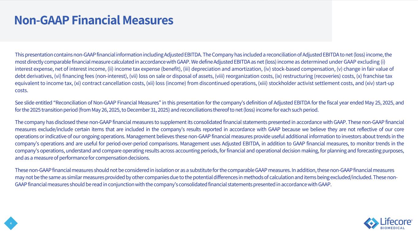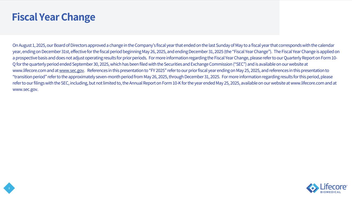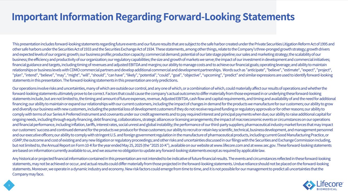 2 Fiscal Year Change On August 1, 2025, our Board of Directors approved a change in the Company’s fiscal year that ended on the last Sunday of May to a fiscal year that corresponds with the calendar year, ending on December 31st, effective for the fiscal period beginning May 26, 2025, and ending December 31, 2025 (the “Fiscal Year Change”). The Fiscal Year Change is applied on a prospective basis and does not adjust operating results for prior periods. For more information regarding the Fiscal Year Change, please refer to our Quarterly Report on Form 10- Q for the quarterly period ended September 30, 2025, which has been filed with the Securities and Exchange Commission (“SEC”) and is available on our website at www.lifecore.com and at www.sec.gov. References in this presentation to “FY 2025” refer to our prior fiscal year ending on May 25, 2025, and references in this presentation to “transition period” refer to the approximately seven-month period from May 26, 2025, through December 31, 2025. For more information regarding results for this period, please refer to our filings with the SEC, including, but not limited to, the Annual Report on Form 10-K for the year ended May 25, 2025, available on our website at www.lifecore.com and at www.sec.gov.