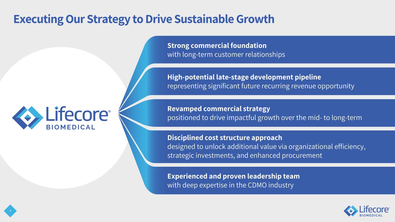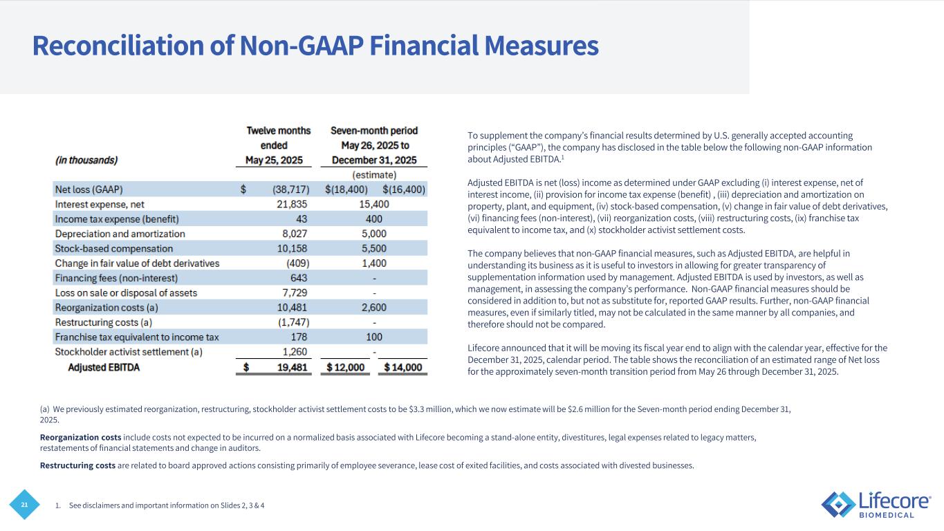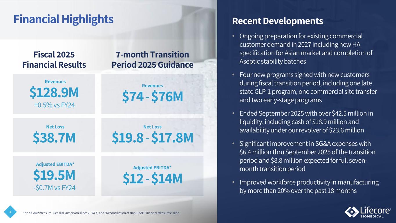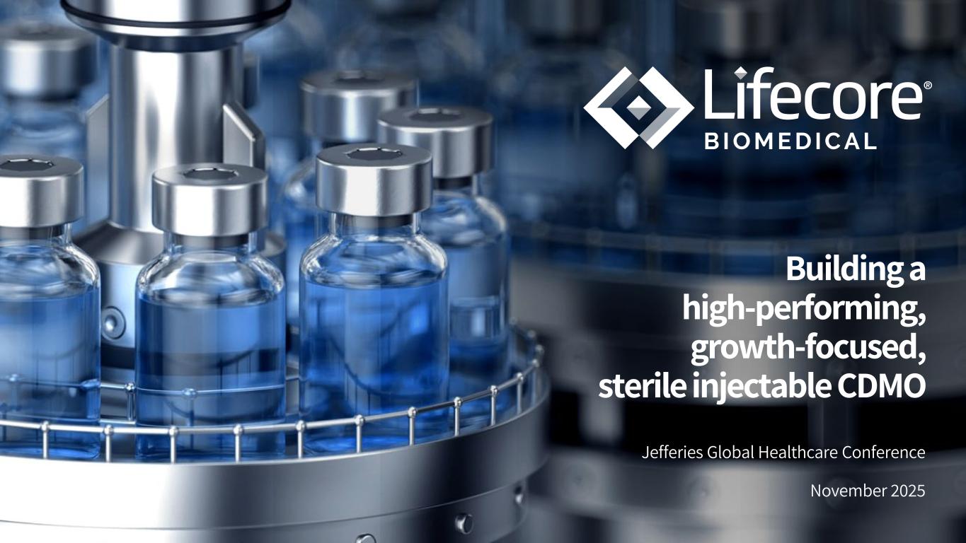 2 Fiscal Year Change On August 1, 2025, our Board of Directors approved a change in the Company’s fiscal year that ended on the last Sunday of May to a fiscal year that corresponds with the calendar year, ending on December 31st, effective for the fiscal period beginning May 26, 2025, and ending December 31, 2025 (the “Fiscal Year Change”). The Fiscal Year Change is applied on a prospective basis and does not adjust operating results for prior periods. For more information regarding the Fiscal Year Change, please refer to our Quarterly Report on Form 10- Q for the quarterly period ended September 30, 2025, which has been filed with the Securities and Exchange Commission (“SEC”) and is available on our website at www.lifecore.com and at www.sec.gov. References in this presentation to “FY 2025” refer to our prior fiscal year ending on May 25, 2025, and references in this presentation to “transition period” refer to the approximately seven-month period from May 26, 2025, through December 31, 2025. For more information regarding results for this period, please refer to our filings with the SEC, including, but not limited to, the Annual Report on Form 10-K for the year ended May 25, 2025, available on our website at www.lifecore.com and at www.sec.gov.