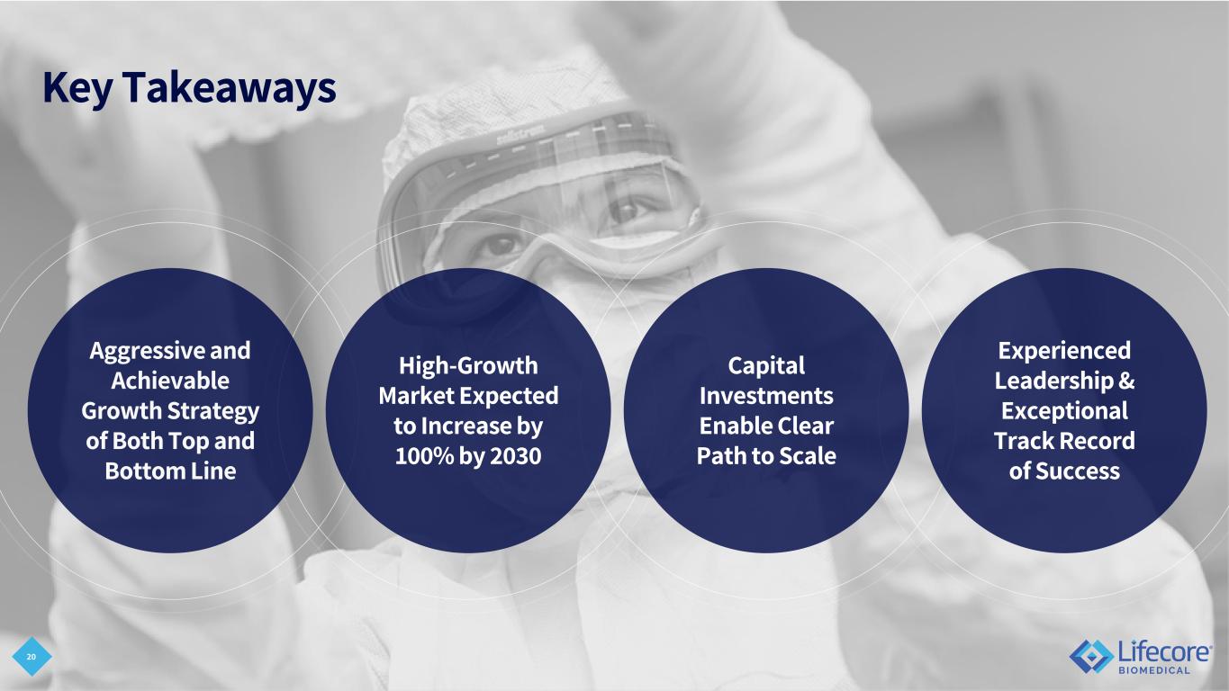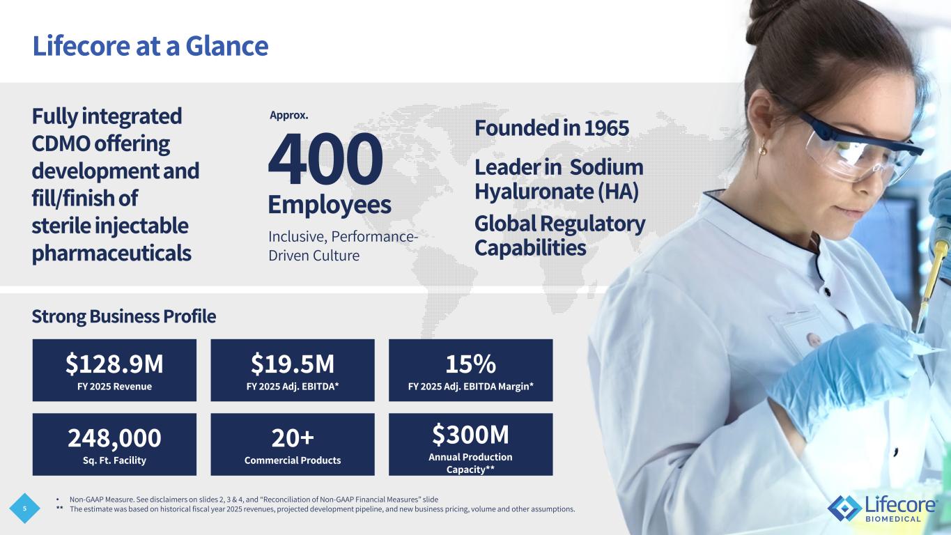 3 Important Information Regarding Forward-Looking Statements This presentation includes forward-looking statements regarding future events and our future results that are subject to the safe harbor created under the Private Securities Litigation Reform Act of 1995 and other safe harbors under the Securities Act of 1933 and the Securities Exchange Act of 1934. These statements, among other things, relate to the Company’s three-pronged growth strategy; growth drivers and expected levels of our organic growth; our business profile; production capacity; commercial demand; potential of our late stage pipeline; our sales and marketing strategy; the scalability of our business; the efficiency and productivity of our organization; our regulatory capabilities; the size and growth of markets we serve; the impact of our investment in development and commercial initiatives; financial guidance and targets, including timing of revenues and adjusted EBITDA and margins; our ability to manage costs and to achieve our financial goals; operating leverage; and ability to maintain relationships or business levels with CDMO commercial partners and develop additional commercial and development partnerships. Words such as "anticipate", "believe", "estimate“, "expect", "project“, "plan", "intend", “believe”, "may", “might”, “will”, “should”, “can have”, “likely”, “potential”, “could”, “goal”, “objective”, “upcoming”, “predict” and similar expressions are used to identify forward-looking statements in this presentation. The forward-looking statements in this presentation are only predictions. Our operations involve risks and uncertainties, many of which are outside our control, and any one of which, or a combination of which, could materially affect our results of operations and whether the forward-looking statements ultimately prove to be correct. Factors that could cause the company’s actual outcomes to differ materially from those expressed in or underlying these forward-looking statements include, but are not limited to, the timing and amount of future expenses, revenue, Adjusted EBITDA, cash flow and capital requirements, and timing and availability of and the need for additional financing; our ability to maintain or expand our relationships with our current customers, including the impact of changes in demand for the products we manufacture for our customers; our ability to grow and diversify our business with new customers, including the potential loss of development customers if they do not receive required funding or regulatory approvals or for other reasons; our ability to comply with terms of our Series A Preferred instrument and covenants under our credit agreements and to pay required interestand principal payments when due; our ability to raise additional capital for ongoing needs, including through equity financing, debt financing, collaborations, strategic alliances or licensing arrangements; the impact of macroeconomic events or circumstances on our operations and financial performance, including inflation, tariffs, interest rates, social unrest and global instability; the performance of our third-party suppliers; pharmaceutical industry market forces that may impact our customers’ success and continued demand for the products we produce for those customers; our ability to recruit or retain key scientific, technical, business development, and management personnel and our executive officers; our ability to comply with stringent U.S. and foreign government regulation in the manufacture of pharmaceutical products, including current Good Manufacturing Practice, or cGMP; the outcome and cost of existing and any new litigation or regulatory proceedings; and other risks and uncertainties discussed in our filings with the Securities and Exchange Commission including, but not limited to, the Annual Report on Form 10-K for the year ended May 25, 2025 (the “2025 10-K”), available on our website at www.lifecore.com and at www.sec.gov. These forward-looking statements are based on information currently available to us, and we assume no obligation to update any forward-looking statements except as required by applicable law. Any historical or projected financial information contained in this presentation are not intended to be indicative of future financial results. The events and circumstances reflected in these forward-looking statements, may not be achieved or occur, and actual results could differ materially from those projected in the forward-lookingstatements. Undue reliance should not be placed on the forward-looking statements. Moreover, we operate in a dynamic industry and economy. New risk factors could emerge from time to time, and it is not possible for our management to predict all uncertainties that the Company may face.
