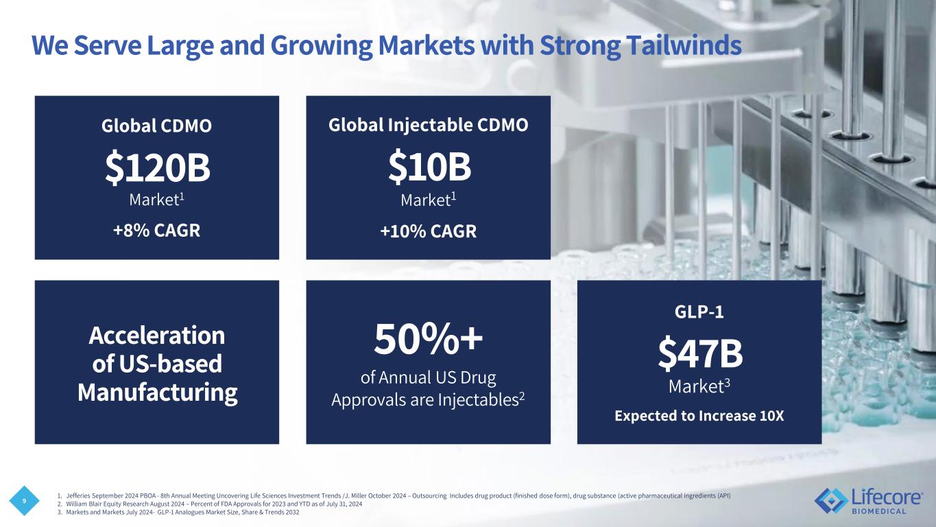 8 Financial Highlights Recent Developments • Ongoing preparation for existing commercial customer demand in 2027 including new HA specification for Asian market and completion of Aseptic stability batches • Four new programs signed with new customers during fiscal transition period, including one late state GLP-1 program, one commercial site transfer and two early-stage programs • Ended September 2025 with over $42.5 million in liquidity, including cash of $18.9 million and availability under our revolver of $23.6 million • Significant improvement in SG&A expenses with $6.4 million thru September 2025 of the transition period and $8.8 million expected for full seven- month transition period • Improved workforce productivity in manufacturing by more than 20% over the past 18 months Fiscal 2025 Financial Results 7-month Transition Period 2025 Guidance $128.9M Revenues +0.5% vs FY24 $38.7M Net Loss $19.5M Adjusted EBITDA* -$0.7M vs FY24 $74 - $76M Revenues $19.8 - $17.8M Net Loss $12 - $14M Adjusted EBITDA* * Non-GAAP measure. See disclaimers on slides 2, 3 & 4, and “Reconciliation of Non-GAAP Financial Measures” slide