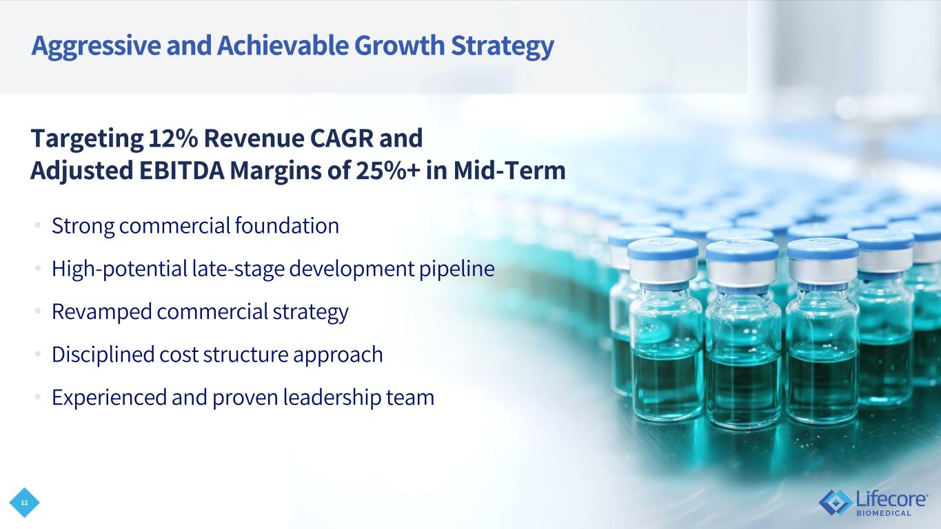 11 The Lifecore Difference: Why We Win and Why They Stay Technical Expertise Decades of proven experience in complex injectables Integrated Model Development to commercialization Quality Multi-compendial regulatory system