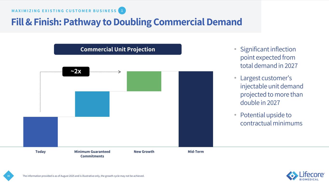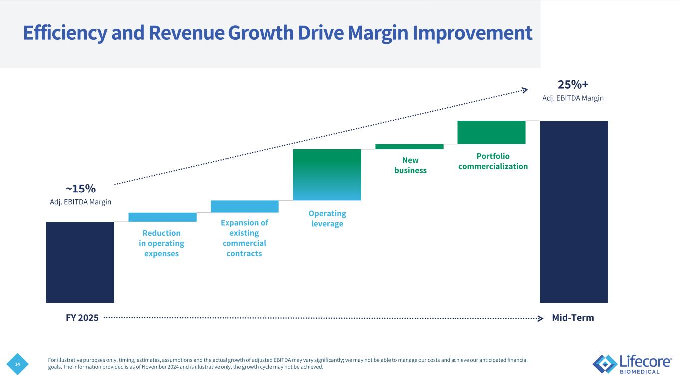 13 FOCUSED ON MAXIMIZING UTILIZATION OF AVAILABLE CAPACITY Mid-Term and Long-Term Revenue Outlook Expansion of existing commercial contracts Portfolio Commercialization New Business Revenue growth driven by maximization of existing customer base, portfolio commercialization, and new business 45M Units 45M Units 45M Units 20% ~40% ~100% Available Capacity Capacity Utilization The information provided is as of August 7, 2025, and is for illustrative purposes only; the growth cycle may not be achieved. Based on estimates derived from internal testing and historical capacity data. FY 2025 Mid-Term Long-Term ~12% CAGR $129M $178M-$205M $300M1