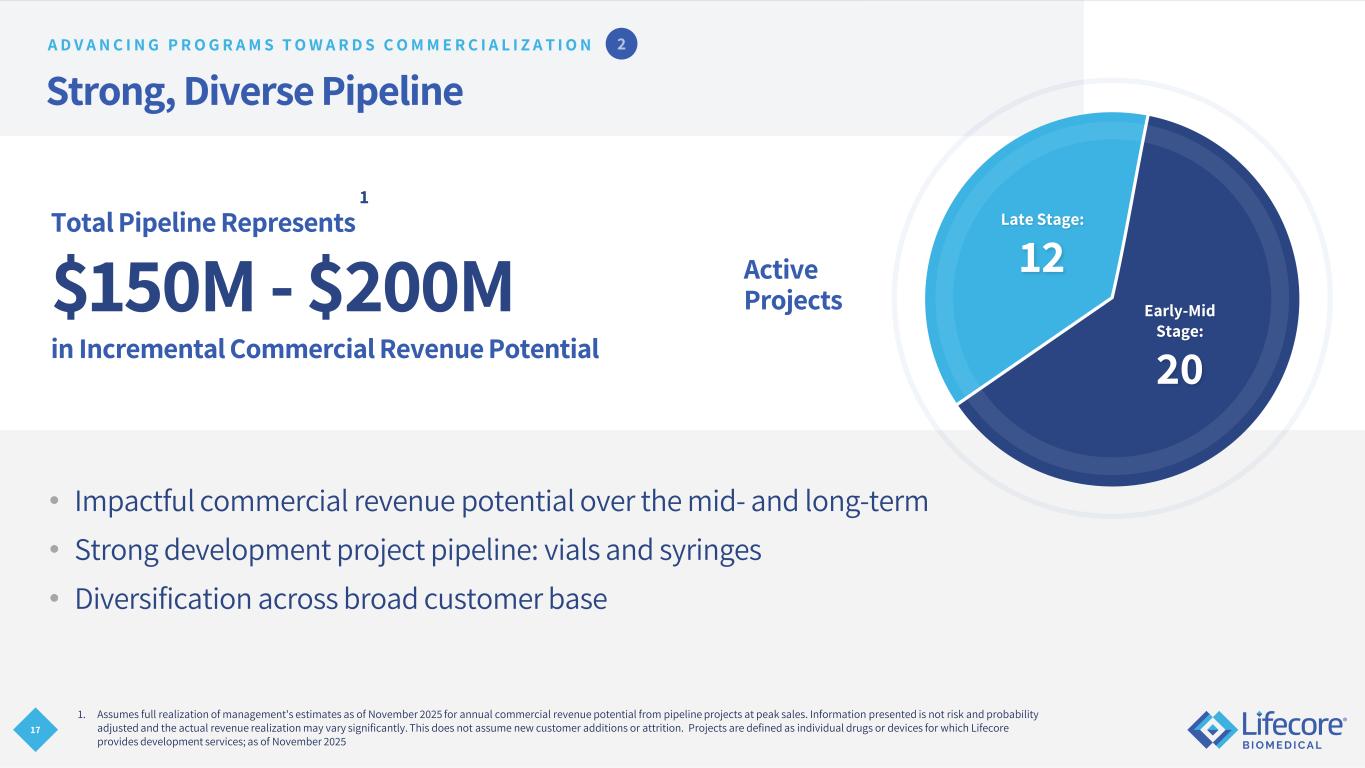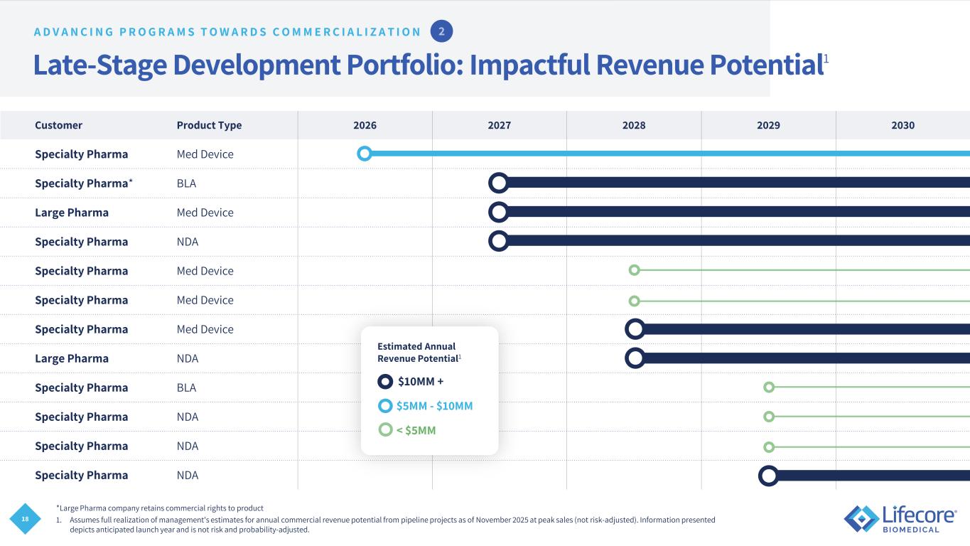 17 Strong, Diverse Pipeline • Impactful commercial revenue potential over the mid- and long-term • Strong development project pipeline: vials and syringes • Diversification across broad customer base Total Pipeline Represents 1 $150M - $200M in Incremental Commercial Revenue Potential 1. Assumes full realization of management's estimates as of November 2025 for annual commercial revenue potential from pipeline projects at peak sales. Information presented is not risk and probability adjusted and the actual revenue realization may vary significantly. This does not assume new customer additions or attrition. Projects are defined as individual drugs or devices for which Lifecore provides development services; as of November 2025 Active Projects Late Stage: 12 Early-Mid Stage: 20 A D V A N C I N G P R O G R A M S T O W A R D S C O M M E R C I A L I Z A T I O N