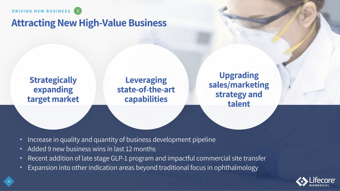 18 Late-Stage Development Portfolio: Impactful Revenue Potential1 Customer Product Type 2026 2027 2028 2029 2030 Specialty Pharma Med Device Specialty Pharma* BLA Large Pharma Med Device Specialty Pharma NDA Specialty Pharma Med Device Specialty Pharma Med Device Specialty Pharma Med Device Large Pharma NDA Specialty Pharma BLA Specialty Pharma NDA Specialty Pharma NDA Specialty Pharma NDA *Large Pharma company retains commercial rights to product 1. Assumes full realization of management's estimates for annual commercial revenue potential from pipeline projects as of November 2025 at peak sales (not risk-adjusted). Information presented depicts anticipated launch year and is not risk and probability-adjusted. $10MM + $5MM - $10MM < $5MM Estimated Annual Revenue Potential1 A D V A N C I N G P R O G R A M S T O W A R D S C O M M E R C I A L I Z A T I O N